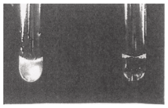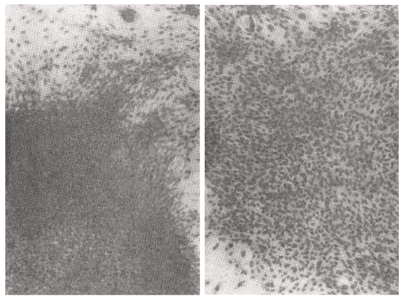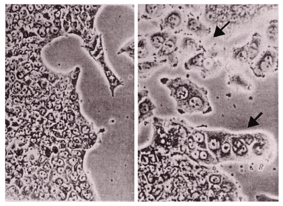 Figure 16 Microscopic observations of the black sites under high magnification. Mouse kidney cells (103) were seeded in the absence (left side) and presence (right side) of SA( 35μg/ml). SV40 virus (3.5 x 106PFU) was infected. They were grown up for 14 days. There is confirmatively cell to cell contact inhibition on the right side photograph in comparison with left side photograph which showed transformation and aggregation.