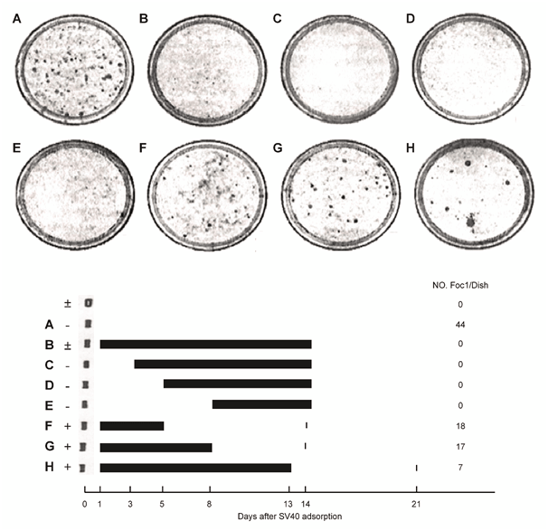 Figure 17 Inhibition of SV40 virus-transformation by SA. Mouse kidney cells (103) were treated with SV40 virus (107PFU/0.2ml) or Hanks’ BSS in the presence (+) or absence (-). And 1.5 x 104cells/ dish were seeded in the low calcium medium on day 1. SA (35μg) was subsequently added as shown black bar. Foci were scored on day 4 or 21.
