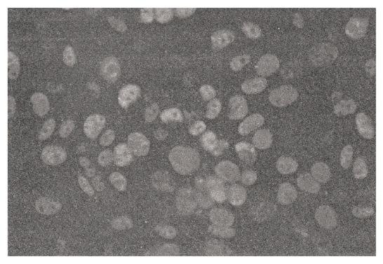 Figure 19 Fluorescent colors was admitted when T-antigen was produced When SV40 virus was infected on CV1 cell and viral DNA is incorporated into nuclear DNA, T-antigen will be produced on the cell surface. SV40 virus (3.5 x 104PFU) 0.1ml was cultured on monolayer of CV1 cell with SA( 35μg/ml) 1.4ml of tissue culture solution was added. Day 5 and 10, coverslip was washed with PBS and fixed with acetone for 10 minutes. Anti-SV40 T serum ( cancer borne hamster serum 1:20) 0.1ml was incubated for 25 minutes at 37°C. After washing with PBS, stained with anti-Hamster-γ-FITC (1:15, Sanko―Junyaku) and washed with PBS and D2W and enclosed with 90% glycerol.