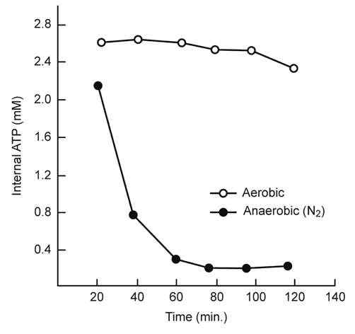 Figure 22 Reitzer et al.42 has demonstrated that the concentration of ATP in Hela cells incubated in the absence of sugar with or without oxygen. Cells were pregrown in Minimum Essential Medium Joklik, 5% nondialyzed fetal calf serum spinner cultures, which support exponential growth to 106cells/ml. At 3x105cells/ ml, 200ml was centrifuged at 1500g for 15min at room temperature and immediately re-suspended in 10ml of Minimum Essential Medium Jolik containing 20mM 4-(2-hydroxyethyl)-L-piperazine-ethane-sulfonic acid, pH 7, without serum or glucose. The medium used for the anaerobic incubation had been deoxygenated by bubbling 100% N2 though it for at least 10min. the cells were re-suspended gently to avoid oxygenating the medium and the gassing continued above the medium during the incubation. The aerobic culture was exposed to the atmosphere. The flasks were shaken rapidly in a water bath at 37°C. At the indicted times, 1.5ml of culture was mixed with 0.25ml of 2.4N HClO4 with 8mM EDTA at 0°C.,and centrifuged at 12,006g for 20min. The supernatant was neutralized with KOH, using the phenol red indictor present in the medium, and after removing potassium perchlorate by centrifugation, ATP was measured as described.42