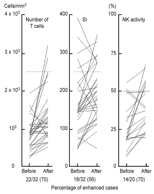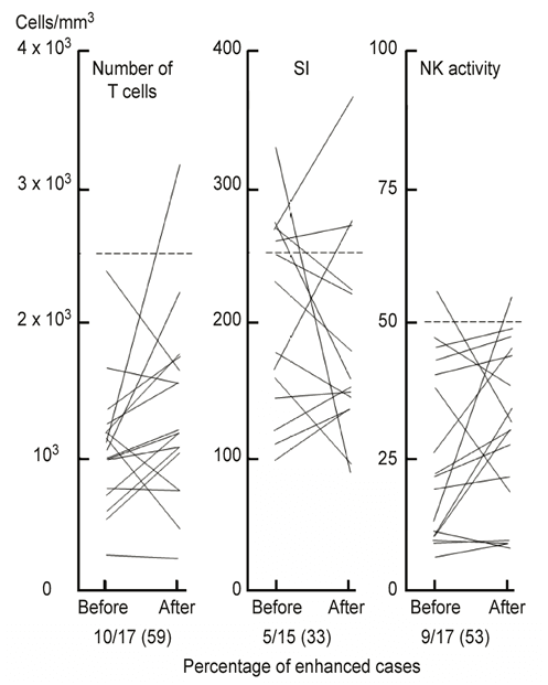 Figure 25 Adoptive lymphocytes therapy on advanced cancer patients Lymphocytes was gotten from 100ml of donor’s blood by centrifugation method utilizing Lymphoprep ® and suspended in physiological serine and made suspension of 1~2 x 108/ml SI is stimulation index by PHA. So as to release cancer antigen from cancer tissue, we have manipulated cancer patients utilizing the combination of vitamin A (5x104U) and sauna bathing at 56°C. For 20 minutes. Adoptive lymphocytes were infused after 24~30 hours inducing cancer antigen treatment.