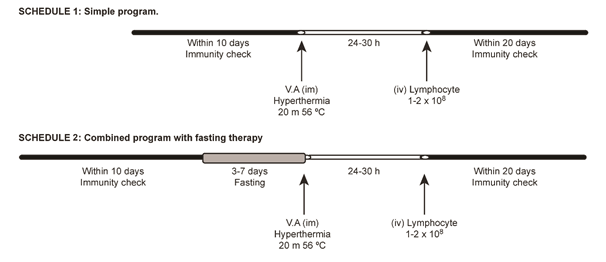 Figure 26 Lymphocyte adoptive immunotherapy treatment’s schedules. So as to release cancer antigen from cancer tissue, we have manipulated cancer patients utilizing the combination of vitamin A (retinoic acid: 5x104 U) and sauna bathing at 56°C for 20 minutes. Adoptive lymphocytes were infused after 24~30hours inducing cancer antigen treatment.
