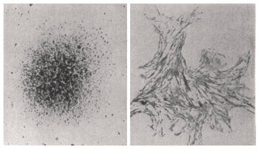 Figure 14 Inhibiting effect of SA on SV40-transformation of mouse cells without SA.C3H mouse kidney cells (103) were seeded on one plate in the absence of 35μg/ml of SA and infected with SV40 virus ( 106PFU/0.2ml). Aggregation and pile up are observed.