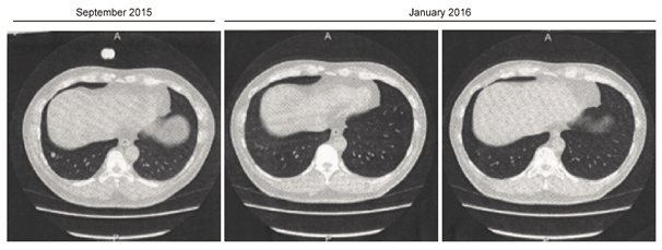 We applied this treatment on a recurred patient (48 years old male) who suffered from the recurrence of Leiomyosarcoma as pathological diagnosis on the upper right hand. After surgical resection (27, May, 2015), the sarcoma metastasized to the lung in September, 2015. Chemotherapy was performed with doxorubisin (126mg), but it did not disappear by December, 2015. Therefore, the patient presented at my hospital, and he subsequently received the cancer re-differentiation-inducing treatment (Figure 36). Left photograph shows a CT at September, 2015, center and right photograph show the CT at January, 2016. As shown in CT image, metastases have clearly disappeared after January 2016 (Table 1). The patient’s initial risk assessment according to the TMCA was classified as tumor stage V (=G2), whereas, in July 2017, the TMCA risk assessment was classified as TS (III). There is no relapse of recurrence for 2 years after he received re-differentiation inducing treatment.