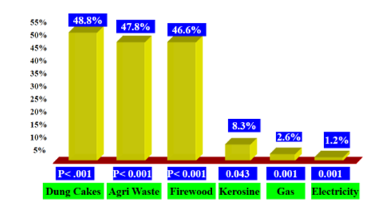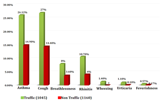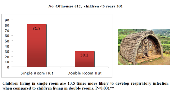 Asthma is increased in summer season from 2.8% to 28.8% between 1994-2009 and is hypothesised due to secondary production of increased ozone level Figure 4.11 Double the number of traffic police personnel suffer from air pollution than non-traffic police personnel as shown in Figure 5.12 Use of non-commercial cooking fuel has shown 6 times more prevalence of asthma Figure 6. Children living in single room, ill ventilated huts and use of non-commercial cooking fuel showed 10 ½ times more prevalence of Acute respiratory infection Figure 7.10 Single person smoking in the house increases the prevalence of asthma by 3 times Figure 8.10