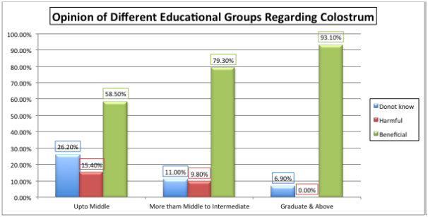A healthy start in life is the most precious gift one can make to a newborn. Milk is such unique gifted complex which is ideal food for the healthy growth and development of infant. Breastfeeding is the natural way to enhance immunity as well. There is no substitute to the human milk. Today with modernization, new formula milk has been introduced. These are a good alternative for specific situation but these cannot be the best alternative for proper development of the child. Breastfeeding leads to the better immunity to fight infectious diseases and it is easily digestible. Colostrum, the initial milk, is very important from medical point of view. Epidemiological data has proven various benefits of breast feeding and risk associated with early cessation of breast feeding.1−4 It is evident from the studies that 1.5 million lives could be saved each year if infants were fed according to recommended breastfeeding practices. The recommended duration of breastfeeding has critical effect in the long run. Studies shown that if proper duration is followed then maximum benefits are achieved. It has equal benefits for mother and the child. Even there is reduction of childhood obesity and cardiovascular diseases when duration of breastfeeding is followed properly.5 Breast milk has important function in promoting sensory and cognitive development against chronic and infectious diseases. The breast milk is not only decreasing the incidence of diarrhea and respiratory diseases but also helping quick recovery after the infections.6 Breast feeding is also providing benefits to the mothers like decrease in reduction of the ovarian and breast cancers as later is increasing day by day. Breast feeding is the natural way of reducing the risk and making mother healthy in the long term.7 Education plays an important role in initiation of breastfeeding. In one of the study of Bangladesh, 49.5% of women with higher education levels were keen to give their child colostrum as well as they had better knowledge regarding breastfeeding as compared to illiterate women.8 Education leads to better understanding of the relationship between the breast milk and its duration. Various factors like socioeconomic status, mode of delivery, cultural aspects and maternal education are likely to affect the breast feeding practices.9 Culture also has an influence on breastfeeding practices. In few of the cultures, infants are being withhold for breast milk for 48 hour reason being, the initial milk is considered dirty or not real milk. In Asia, initially infants are given honey or gutti instead of mother initial milk. The main reason behind this practice is the lack of education and awareness about breast feeding.in one of the study in Lebanon, women believed that they might transfer their abdominal cramps to the newborn .That was the reason of avoiding the exclusive breastfeed. It has been found that mothers who are better educated are more likely to have knowledge of breast feeding and are more likely to practice it.10 In one of the study done by Victor Mogre, among different factors maternal level of education was one of the determinant of practicing exclusive breast feeding. It was also proposed, that along with health messages, proper counselling by the health professional should be done to educate the mothers.11 Counselling which is done at the first level of contact in the community has impact. The staff involved are the local and peers that can guide the mother in the way most effective to them. The objective of the study was to determine the impact of maternal education and source of knowledge on breast feeding practices of women in Pakistani setting.