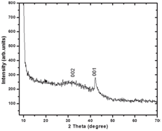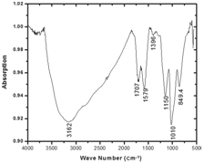 Figure 1B shows that UV/Visible absorption spectrum of graphene oxide sample prepared using Hummers method. A peak at 232nm, which is due to π to π∗ transition of the functional groups C=O and C=C of GO, this experimental spectra data is matched with published results.18 Figure 1C shows the XRD pattern of graphene oxide synthesised using Hummers method. The (002) peak of graphene oxide having reduced intensity and highly broaden, which indicates that the Graphene oxide composed of mainly single carbon sheets and having a high density of pores.26 No other additional peaks were observed, it confirms that the sample has purity.28 Figure 1D shows the spectrum of graphene oxide, the peak at 1707cm−1 is characteristic of the C=O stretch of the carboxylic group on the graphene oxide and also 1579cm−1 is characteristic of the C=O stretch. The peak at 1396cm−1 is characteristic of the C-C stretch of aromatic compound. The peak at 1010cm−1 is characteristic of the C-O stretch. The peak at 3162cm−1 is characteristic of O-H high concentration broad peak.19. Above results reveal the existence functional groups of –OH and –COOH on GO surface.