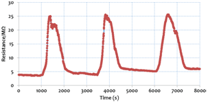 Figure 2A shows the response curve of the sensing material graphene oxide at room temperature (25±3oC) exposed to 50ppm formaldehyde at room temperature. The output resistance signal depicts the drop from the resistance RAir to the equilibrium value RHCHO that occurs when the formaldehyde gas enters the test chamber and its purging brings back to the background value indicating the absence of alcohol. Response time t90 (time needed to obtain a result equal to 90% of the equilibrium signal) and the recovery time tR (time needed to bring the signal back to 90% of the HCHO background signal) both were 398s and 587s. The sensor response for 50 ppm of HCHO was 6.98. A decrease in the output resistance when the formaldehyde contacts the graphene oxide surface implies a decrease in sensor resistance, indicating that the graphene oxide is p-type semiconductor formaldehyde sensor. Table 1 gives the sensing properties/data of graphene oxide to 50ppm formaldehyde. Graphene oxide sensors also had sensor responses (S=RHCHO/RAir=6.98), middle response times (t90=398s) and recovery times (tR=587s). Figure 2B presents the series response curves versus time of graphene oxide to 50 ppm HCHO. It showed the three peaks are quite the same, so the short-term stability of GO to detect HCHO is good. But the baseline of the curve was increasing with additional time; it could be some force between the HCHO and GO surface.