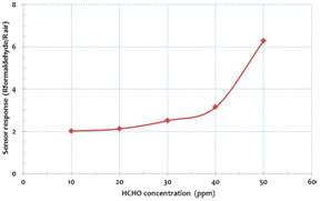 Figure 2C shows sensor responses versus 10 to 50ppm formaldehyde concentration of graphene oxide. Obviously, sensor response increased with increasing formaldehyde concentration. The responses of the sensor were 2.11 and 6.98 (S=RHCHO/RAir) to the concentrations of 10 and 50ppm, respectively. Table 1 revealed that the response and recovery times were decreasing by increasing the formaldehyde concentration from 10 to 50 ppm in graphene oxide. It showed on 10 ppm formaldehyde the response and recovery times were 742 and 1200s, respectively, and to 50 ppm formaldehyde, the response and recovery times were decreasing as 398 and 587s, respectively.