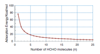 From the analysis of UV/Vis, XRD and FT-IR spectra in Section 3.1, the existence functional groups of –OH and –COOH on GO surface in the simulation model. By using the computation MS 4.3 adsorption method, the energy of the formaldehyde molecule for graphene oxide material surface adsorption was measured as an exothermic reaction. Figure 2D revealed the side view of formaldehyde adsorption on graphene oxide, and the formaldehyde adsorption number is 10. The adsorption bond lengths of O-H (O atom is from HCHO and H atom is from graphene oxide) were calculated as 2.91×10−8 to 2.98×10−8 cm from Figure 2D. The bond length belongs to the normal hydrogen bond. In Figure 2E revealed that one formaldehyde molecule of adsorption heat was −76.4kcal/mol, and this value was close to the chemical adsorption (−40kcal/mol). Figure 2E, the molecular adsorption exothermic value (−kcal/mol) fell while the molecular number of the formaldehyde molecule rose. Therefore, some of the HCHO molecules are irreversibly adsorbed on the GO surface and the background curve with an increase in time (Figure 2B). When the formaldehyde adsorption number was increased to 10, the molecular adsorption exothermic value was fallen to the value as −10.1kcal/mol. This value was close to the normal hydrogen bond (−10kcal/mol). When the formaldehyde adsorption number was increased to 26, the molecular adsorption exothermic value fell to −3.98 kcal/mol. This value was close to the weak hydrogen bond (−4kcal/mol). The bond energy is larger than Van der Waals force (−1kcal/mol). However, under the actual state, many HCHO molecules adsorption and the adsorptive capacity is far bigger than 26. Therefore, under the actual state, the formaldehyde molecule was close to weak hydrogen bond adsorption on the material surface. Therefore, the middle response times (t90=398s) and recovery times (tR=587s) appeared in the sensing curve. Above simulation results can explain the sensing data of section 3.3. For 10ppm HCHO gas input, the response and recovery times were 742 and 1200s, respectively. Increasing formaldehyde concentration to 50ppm, the response and recovery times were decreasing as 398 and 587s, respectively (Table 1). While HCHO concentration is increased, response and recovery times are decreased. The reason is if the HCHO concentration is low, most of the HCHO molecules with strong chemical adsorption or normal hydrogen bond adsorption. So the HCHO molecule is not easily desorbed and adsorbed, therefore the response and recovery time could be larger in low concentration HCHO.