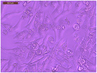 Propagation of the HEP-2 cell line: Human laryngeal squamous cell carcinoma (HEp2) cells were acquired from VACSERA® and grown in a sterile tissue 50cm2 flask in a complete medium that contained Dulbecco’s modified Eagle’s medium (DMEM), with a supplement of antibiotics (100U/ml penicillin and 100 μg/ml streptomycin) and 10% fetal bovine serum (FBS) in 95% air, 5% CO2 at 37°C (Figure 1). According to the time interval of 24, 48 and 72 hours, the cell line was propagated and subdivided into three separate groups.