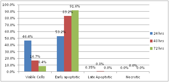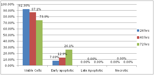Control group: Results showed that 92.3% of untreated HEP-2 cells were viable after 24 hours, while 7.69% of the cells showed early apoptotic changes. No late apoptotic changes or necrotic cells were observed. After 48 hours, 87.1% of the cells were viable cells, while 12.9% showed early apoptotic changes. Further, there were no late apoptotic changes or necrotic cells. However, after 72 hours, 73.9% of the cells of the HEP-2 cell line were viable, while 26.1 % showed early apoptotic changes (Figure 3). No late apoptotic changes or necrotic cells were observed.