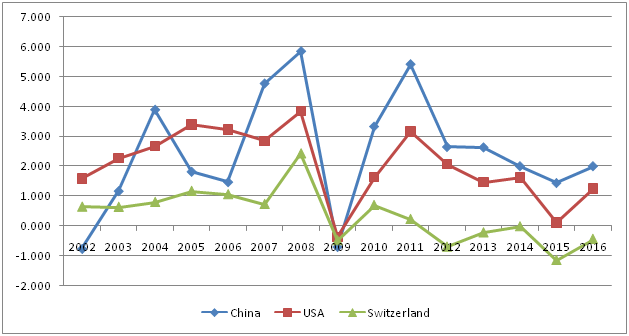 Figure 2 shows the dynamics of inflation in China, the United States, and Switzerland, which has led the ranking of countries' competitiveness for more than one year in a row. Here you can see the peak of 5.9% for China in the post-crisis year and its subsequent decline to 2% in 2015. Through effective monetary policy, China has achieved consistently low inflation, which has become an additional way to attract investment (Figure 2).