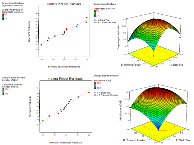 Considering RSM, the process order fits to quadratic design model, the adequacy of models (Table 1& 2) and model summary statistics (Table 3 & 4) justified by the analysis of variance (Table 5 & 6) considering organoleptic score as response 1 and inhibition of AChE as response 2. The model summary statistics focus on the model maximizing the “Adjusted R-squared” and the “predicted R-squared”. The R-squared values of 0.9397 (Table 3) and 0.9817 (Table 4) having closeness to unity showed a good fitness between the actual and that obtained from the response model. The "Pred R-Squared" value of 0.5735 is not as close to the "Adj R-Squared" of 0.8966 (Table 3) as normally expected and the reason may be due to block effect and to consider model reduction or response transformation. However,"Adeq Precision" that measures the signal to noise ratio, a ratio greater than 4 is desirable. The ratio of 11.106 (for response 1) indicates an adequate signal and the model can be used to navigate the design space. Considering response 2, the "Pred R-Squared" value of 0.8736 is in reasonable agreement with the "Adj R-Squared" of 0.9687 (Table 4) and the "Adeq Precision" of 22.062 (for response 2) indicates an adequate signal and the model can be used to navigate the design space. The average leverage was 0.4615 and VIF close to 1.0 was obtained.