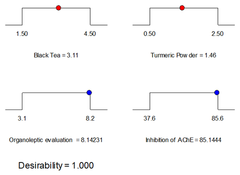 Basing on the desirability function, 3.11g of black tea and 1.46g of ground turmeric powder was added to 120mL of boiling water and steeped for 15 min; the strained liquid is the turmeric black tea (TBT) to which a pinch of black pepper have been added. Under this condition, pharmacologic response (acetylcholinesterase inhibitory effect) and organoleptic acceptability were maintained at optimal.