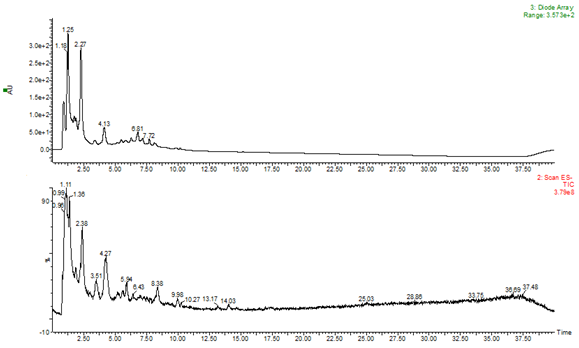 Chemo profiling of TBT was carried out by LC-MS analysis using Zorbax SB-C18 column, acetonitrile and 0.4% acetic acid as the mobile phase, injection volume of 20µL and flow rate of 1mL/min, a run time of 30min and detector wavelength was kept at 430nm. Mass spectrometer with electrospray ionization (ESI) and operating between the positive and negative polarity conditions were used for detecting the catechins in ESI negative modes and the ESI positive mode was used for detecting the theaflavins. The capillary voltage was maintained at 3KV, cone voltage at 30V and extractor voltage at 4V for both positive and negative mode to achieve the best sensitivity for the analytes. The source temperature and desolvation temperature were maintained at 150ºC and 625ºC respectively. The cone gas flow rate was kept at 50L/h and that of salvation gas flow rate at 1100L/h.19,20