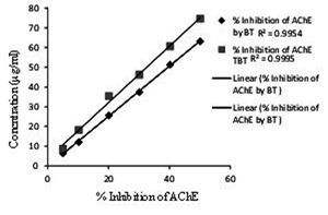 Since acetylcholinesterase (AChE) involves breakdown of acetylcholine, inhibition of AChE is considered as one of the treatment strategies against several neurological disorders including Alzheimer.26 The test relies on the cleavage by AChE of 1-naphthyl acetate to form α-naphthol, which in turn reacts with fast blue B salt to give a purple colored diazonium dye. AChE activity was measured using 1-naphthyl acetate as a substrate. Production of 1-naphthol was monitored spectrophotometrically by measuring the absorbance at 320nm.26