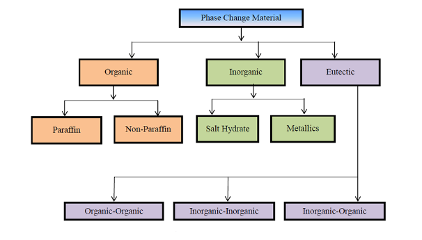 The phase change materials (PCMs) are generally divided into two groups: organic and inorganic. Inorganic compounds show a volumetric latent TES capacity twice that of organic compounds. But the organic substances could serve as important heat storage media because of several advantages from their natural properties like, ability to melt congruently, self-nucleation, non-toxic and non-corrosiveness, environment friendly etc. Alkanes and paraffin are in the latter category. Figure 2 shows various common materials for sensible and latent heat storage systems.