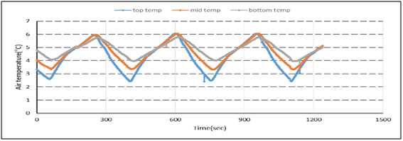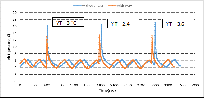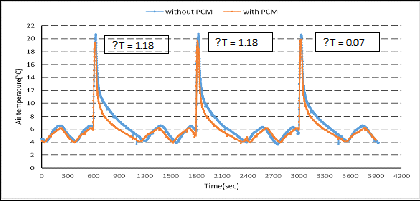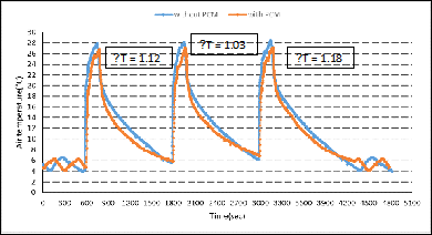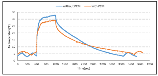 Test conducted for opening the door for 10 minutes. The graph plotted between air temperature and time is given in Figure 15: From Figure 15, it is observed that the temperature rises to 32 °C during door opening for 10 minutes. The use of PCM maintained the air temperature 3.5 °C lower than that of without PCM.