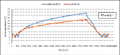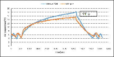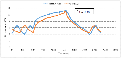 Test conducted for electrical power failure for 1 hour. The graph plotted between air temperature and time is given in Figure 18: From Figure 18 it is observed that electrical failure of 1 hour could cause rise in temperature to 18 °C. The use of PCM maintained the air temperature 3.1 °C lower (up to 15 °C) than that without PCM.