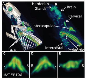 Figure 1 Courtesy ref no 164‒PET Images from Class1 drug Effects on Rat BAT‒CL316,243 induced activation of BAT is seen in the PET image (A) regional localization confirmed by PET/CT (B) Interscapular, periaortic, cervical and intercostal BAT regions are evident. The bilateral structure of activated interscapular BAT (IBAT) is evident in the ventral (C), dorsal (D), caudal (E) views of IBAT.