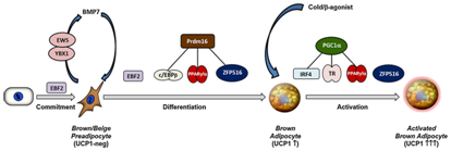 Figure 2 Courtesy ref no54‒Transcriptional modulation of brown fat cell differentiation and activation,Ebf2 marks the committed brown adipocytes and regulates the commitment process from upstream stem cells.EBS/YBX1 regulates BMP7 production which then acts in an augmented manner inducing brown adipogenesis.Ebf2,PRMT, ZFP516 specifically regulate the induction of brown specific genes. The differentiation process of PRDM 16 co activators, C/EBP β, PPAR γ, PPAR α, thyroid receptor (TR) and ZFP 16.Upon cold exposure, β adrenergic agonist treatment of brown fat cells are activated to undergo thermogenic and beige adipocyte expression of thermogenic genes.IRF4 plays a major role in process through recruiting PGC‒1α coactivator,PGC‒1α can also coactivate PPAR’s and TR to activate the transcription of thermogenic genes.