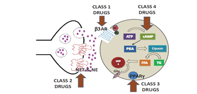 Figure 3 Courtesy ref no 164.‒ Schematic of Sites of Drug Action: Class 1 drugs act on the adipocyte cell membrane bound _3 adrenergic receptor (_3AR) triggering a cascade of events via c AMP. Class 2 drugs act on the norepinephrine transporter (NET) on the sympatheic nerve terminal and increase norepinephrine (NE) levels which then stimulates _3AR. Class 3 drugs activate Peroxisome proliferator‒activated receptor gamma (PPAR). Class 4 drugs act on various pathways within the a dipocyte.