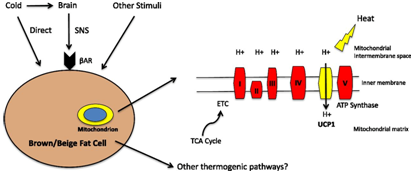 Figure 4Courtesy ref no‒89 Schematic adaptive thermogenesis in brown and beige adipocytes .This process is typically thought of as beige indirectly activated by cold via the sympathetic nervous system (SNS)catecholamine stimulated adrenergic receptors(BAR) ultimately activating UCP‒1 dependent thermogenesis. Adaptive thermogenesis can also be directly activated by cold in beige adipocytes and by other stimuli that may signal independently from the β adrenergic receptors. The reducing equivalent generated by the tricarboxylic acid (TCA)cycle enter the ETC(electron transport chain ).This generates a proton gradient across the inner mitochondrial membrane i9nstead of linking this gradient to ATP synthesis via complex V .UCP1 is able to uncouple this gradient with the chemical energy to heat.