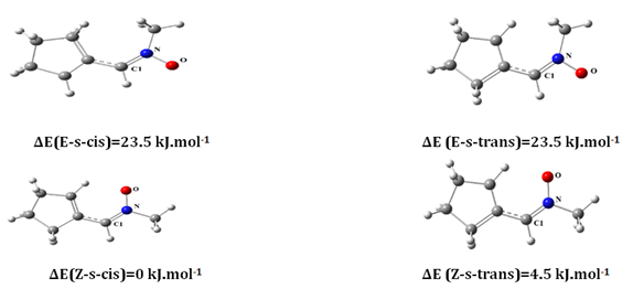The studied nitrones can exist into four isomers Z-s-cis, Z-s-trans, E-s-cis and E-s-trans. The Z/E are used for describing the stereochemistry of the double bonds C=N of the nitrones. The s-cis/s-trans are the conformations of a single bond separating two double bonds C=N and C=C (Figure 1).