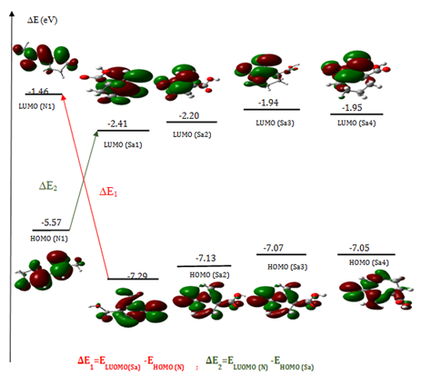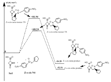 Reaction between norsarkomycin (Sa1) and (Z)-N-(cyclopent-2-en-ylmethylene)-aniline oxide (N2): In the reaction of N-phenyl substituted nitrone with norsarkomycin (Sa1), the mechanism follows a concerted pericyclic pathway. It produces four transition states structures; Z-s-cis-meta, Z-s-cis-ortho, Z-s-trans-meta and Z-s-trans-ortho isomers. The activation energies associated with the cycloaddition reactions are: 63.14 kJ.mol-1 (TSm(s-trans), 67.49 kJ.mol-1(TSo (s-trans), 82.09 kJ.mol-1 (TSm(s-cis)) and 70.08 kJ.mol-1 (TSo(s-cis)) respectively. Consequently, it can be predicted that the s-trans-meta regioisomer will be formed preferentially. These values reveal that Meta approaches are favored in regard to ortho ones along the cycloaddition process, in accord with the FMO analysis (Figures 7 & 8). Moreover, for the thermodynamic stability, the most favored product is the Po (Z(s-cis) as shown in Table 8.