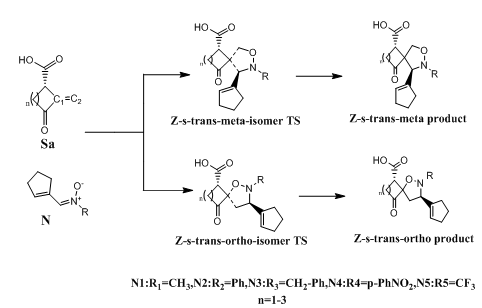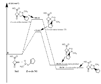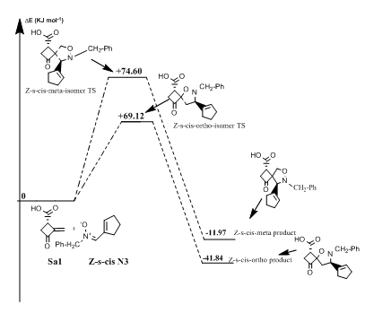 Reaction between (Z)-N-(cyclopent-1-en-1-ylmethylene)-1-phenylmethanamine oxide (N3) and norsarkomycin (Sa1): In the case of R=Bn, the activation energy for the formation of Z-s-trans-meta-isomer is 56.06 kJ.mol-1 whereas that for the formation of the meta-Z-s-cis, ortho-Z-s-trans and ortho-Z-s-cis are respectively 74.60, 64.35 and 69.12 kJ.mol-1, showing that the meta-Z-s-trans-isomer is kinetically favored over the other-isomers transition states. These values reveal that Z-s-trans-meta approach is favored concerning ortho ones along the cycloaddition process, in agreement with the FMO analysis (Figures 9 & 10).