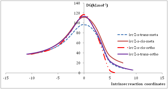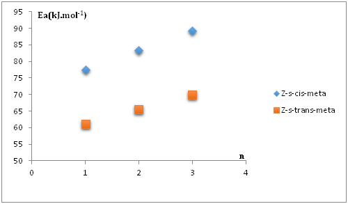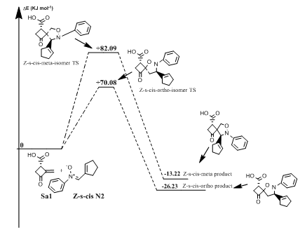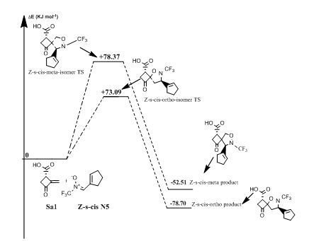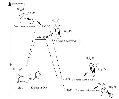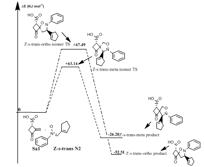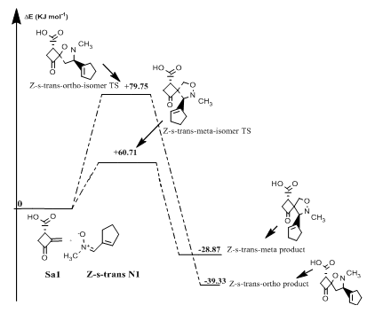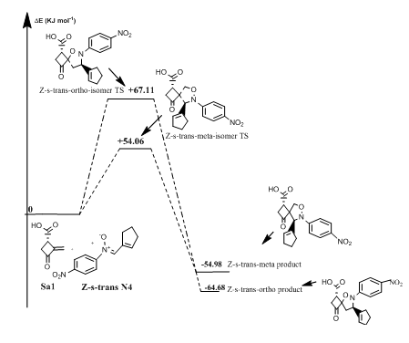 From Figure 16 it can be predicted the values of activation energies correspond to the reactions between nitrone1 and Z-s-cis Sa5 and Z-s-trans Sa5 respectively are equal to 71.65 kJ.mol-1 and 56.79 kJ.mol-1. For the DFT mechanistic studies, we have fully optimized the transition states structures of the reaction between Sa5 and the (Z-s-trans/Z-s-cis) nitrone1 isomers; we have obtained activation energies of values respectively: 60.4 kJ.mol-1 for (s-trans) and 73.23 kJ.mol-1 for Z-s-cis-meta isomer.
