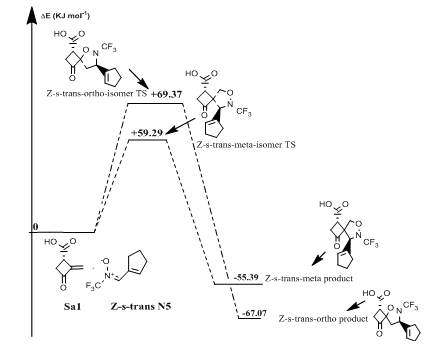 Reaction of (Z)-N-(cyclopent-1-en-ylmethylene)-1,1,1-trifluoromethanamine oxide(N5) with norsarkomycin (Sa5): The transition states of the reactions between the norsarkomycin and different isomers of N5 prove that the cycloaddition is under kinetic control. Furthermore, the activation energies associated with the cycloaddition reactions are: 59.29 kJ.mol-1 (TSm(s-trans)), 69.37 kJ.mol-1 (TSo(s-trans)), 78.37 kJ.mol-1 (TSm(s-cis)) and 73.09 kJ.mol-1 (TSo(s-cis)). Therefore, it can be predicted that the Z-s-trans-meta regioisomer will be formed preferentially. These values reveal that Meta approaches are favored in regard to ortho ones along the cycloaddition process. This result is in agreement with the FMO analysis (Tables 6-8). Whereas, the ortho-Z(s-cis)-isomer being more stable by 2.6; 6.7 and 8.9 kJ.mol-1 than the Po(s-trans), Pm(s-trans) and Pm(s-cis) respectively (Figures 13 & 14).
