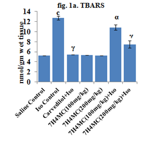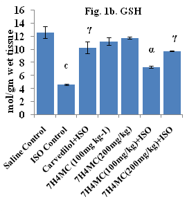 Iso induced MI, damages the cardiac myocytes which results in hypoxia, coronary hypertension, calcium overloading and depletion of energy reserve and excessive production of free radical due to oxidative metabolism of catecholamine.25 GSH has a direct antioxidant function by reacting with superoxide radicals and singlet oxygen followed by the formation of oxidized GSH and other disulfides.27Glutathione plays an important role in the regulation of a variety of cell functions and in cell protection against oxidative injury.28 Peroxidation of endogenous lipid has been shown to be a major risk factor in cardiotoxic action of isoproterenol.29 There is a report showing that free radicals produced by Iso could initiate peroxidation of membrane-bound polyunsaturated fatty acids, leading to both functional and structural myocardial injury.30 In the present investigation, administration of Iso shows a significant reduction (63.34%) in the level of GSH was observed whereas highly significant elevation (58.82%) in the level of TBA was observed in Iso treated group when compared to saline control group of animal. Standard drug (Carvedilol+Iso) treated a group of animal shows a highly significant elevation (55.17%) in the level of GSH whereas highly significant reduction (57.33%) in the level of TBA was observed when compared to positive control groups of animal. 7H4MC (100 and 200mg kg-1+ Iso) treated a group of animal shows a highly significant elevation (36.81 and 52.53%) respectively in the level of GSH whereas highly significant reduction (14.68 and 41.25%) respectively in the level of TBA was observed when compared to positive control groups of animal.