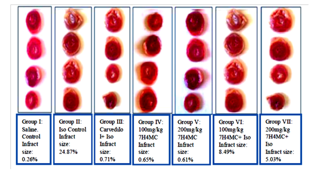 In conclusion, the conducted study showed that ISO injection in experimental animals induces MI which is confirmed by hemodynamic changes, biochemical changes. Treatment with 7H4MC prevents the ISO-induced MI by virtue of its potent antioxidative activity due to the ability to scavenge free radicals and improve the activity of cardiac marker (LDH, ALT, and ALP) and antioxidant (GSH), decrease the lipid peroxidation, in Iso treated rats. All these estimations (biochemical, hemodynamic, TTC Staining and histopathology) have shown that 200mg kg-1 dose of the drug (7H4MC) is more effective than 100 mg kg-1. 200mg kg-1 dose has also shown nearly similar results as that of carvedilol (standard drug).On the basis of this study, it may be suggested that 7H4MC have a cardioprotective activity.