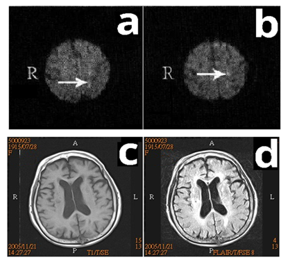 Right basal ganglion MRI: Multiple small acute infarctions in left frontoparietal lobes. Old infarctions in left paracentral gyri and right periventricular white matter. SPECT (1st): Uptake in right basal ganglion and left thalamus higher than usual. SPECT (2nd): Uptake in right basal ganglion is not unusual, but decreased uptake in left thalamus. |