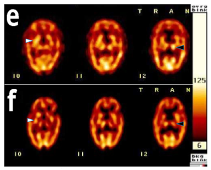 Figure 2 Brain single photon emission computed tomography images showed obtained during and after rabbit syndrome in our patient. A Iincreased uptake in the right basal ganglia (while arrow head) and left thalamus (black arrow head) during presentation of the rabbit syndromedisorder (E), and later after fade‒out, there were n. B. Normal uptake in the right basal ganglia and decreased uptake in the left thalamus were noted after resolution of the condition (F).