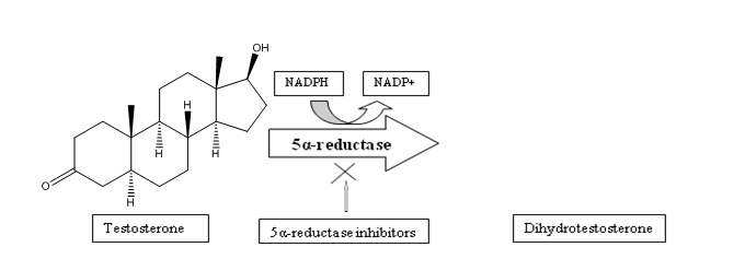 Figure 1 Conversion of Testosterone (T) to Dihydrotestosterone (DHT) by 5α‒Reductase and inhibition of 5α‒Reductase by 5α‒reductase inhibitors.