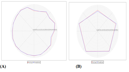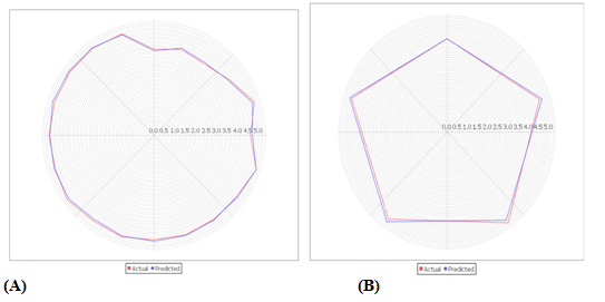 Figure 7 (A‒B) Radar plot showing overlapping of actual and predicted activity of training set molecules by kNN‒ MFA model. Radar plot showing overlapping of actual and predicted activity of test set molecules by kNN‒ MFA model.