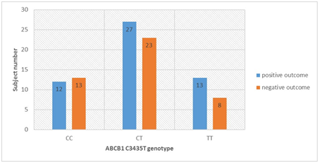 Notes: Distribution of the study subjects according to their ABCB1 C3435T genotype (CC, CT or TT) with respect to observed clinical outcome during the follow-up period.