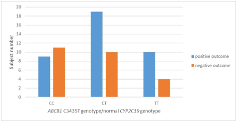 Notes: Distribution of the subgroup of study subjects with normal CYP2C9 genotype (CYP2C19*1/*1) according to their ABCB1 C3435T genotype (CC, CT or TT) and observed clinical outcome during the follow-up period.