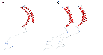 Figure 3 Conformations of -synuclein wild type (Figure & B), mutant (Figure C & D) and truncated forms (Figure E & F) of both the monomer and dimer in the presence of NaCl, generated at 30 ns of simulated trajectory