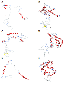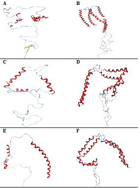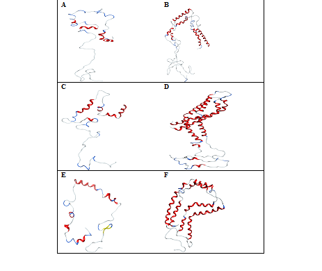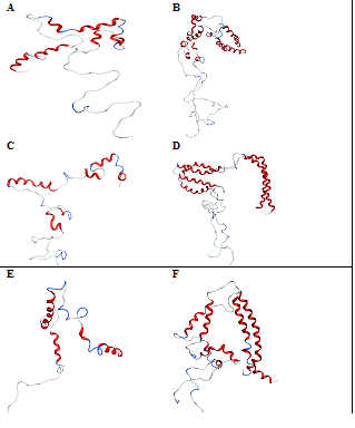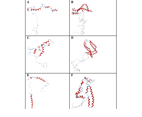 Figure 5 Conformations of -synuclein wild type (Figure A & B), mutant (Figure C & D) and truncated forms (Figure E & F) of both the monomer and dimer in the presence of CaCl2, generated at 30ns of simulated trajectory