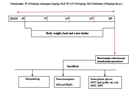 The Female Wistar rats of weight 200‒220gm were divided into six experimental groups (n=5‒6/group) and were matched by body weight. The following six groups were studied for 28 days Figure 1. Normal control (C) rats received only 0.1ml normal saline, SDF of TF parse group (TF 500) rats were received SDF 500mg/kg; po./days, Olanzapine (OLZ) group administered 5mg/kg; po./days of olanzapine to induce metabolic syndrome and study group OLZ with two different dose of SDF of TF at dose 250/500mg/kg; po./days(OLZ+TF 250) and (OLZ+TF 500) respectively; OLZ with Metformin standard group (OLZ+Metformin) 100mg/kg/po/days. The standard and treatment drugs were administered after OLZ treatment. The doses were selected on the basis of literature report.19,29 The body weight, food intake and water intake of rats were evaluated daily. Blood analysis and hemodynamic parameters evaluated after the end of the study 29th day. After these studies, the animals were sacrificed by decapitation to estimate tissues TBARS, GSH levels, and histopathological studies were carried out.