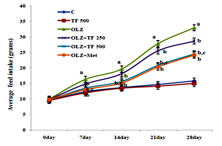 b(p< 0.05) vs olanzapine control group; c(p< 0.05) vs low dose TF (250mg/kg) treatment group