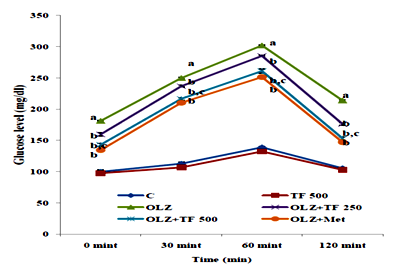 Oral blood glucose concentrations were determined immediately after the rats fasted overnight. The OGTT results for olanzapine group rats at 0, 30, 60 and 120min after solution ingestion are significantly increased (P<0.05) as compared to control groups. Study groups OLZ+TF 250/500 and OLZ+ Metformin group glucose level significantly reduced when compared to OLZ group (P<0.05). OLZ+TF (500mg/kg) showed significant decrease in glucose level at different time intervals compared to OLZ+TF (250mg/kg), (P<0.05) Figure 4. Studies show that OLZ induced glucose and insulin dysregulation may be partly due to blockade of muscarinic M3 receptors, causing disruption to insulin secretion and glucose homeostasis that can progressively lead to insulin resistance and diabetes during chronic treatment. The ability to modify glucose homeostasis perhaps due to the presence of β‒glucan and fiber fraction increased both insulin‒stimulation and basal glucose uptake by AMPK activation as reported in previous studies.