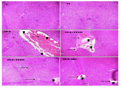 In normal control (C) and TF control, showed the normal histological appearance of the liver hepatocytes and central vein. Hepatocytes were arranged in a network around the central vein. In OLZ group (arrows) showed, edema and necrosis of hepatocytes in the liver cytoplasm. OLZ+TF (250mg/kg) showed less edema and necrotic changes. In OLZ+TF (500mg/kg) and OLZ+ Metformin showed, considerably mild hepatic changes when compared to OLZ group and lesions were localized in some liver lobules in form of degenerative cell foci with fewer cells.