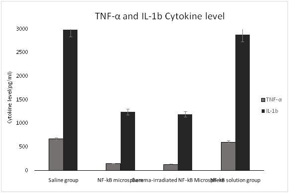 To investigate the biological activity of the antisense microsphere, the in vitro whole blood study was conducted. In this study, the effectiveness of microencapsulation of antisense to NF-kB antisense microspheres was compared before and after gamma radiation to block the TNF-α and IL-1b cytokines. Elaborated description of the method of the experiment has been published before.16 Briefly, the whole blood (35 ml) was drawn from 6 normal human volunteers who were healthy and taking no medications. The blood was separated into aliquots and placed into 1-ml wells. E. coli endotoxin (10 µg) was added to each sample, and samples were incubated. Samples were analyzed by ELISA after 4 h incubation for TNF-α and 24 h for IL-1b.The following groups were studied: NF-kB microsphere group before radiation, gamma-irradiated NF-kB Microsphere group, saline group and NF-kB solution group. All the NF-kB groups contain 200 µg/mL concentration of antisense. The saline group was the control group. Each group contained equal amount of endotoxin (10 µg). The blocking activity was determined by measuring the TNF-α and IL-1b level using ELISA. The result of this study is shown in the Figure 1.