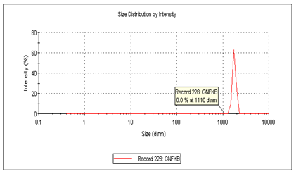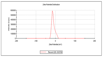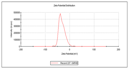 The antisense oligonucleotide containing microspheres were prepared using biodegradable albumin (BSA) polymer in a one-step spray drying process. In the spray drying process, the albumin polymer was crosslinked using glutaraldehyde to construct the matrix where the antisense drug was entrapped. Glutaraldehyde acts as a coupling agent by linking the albumins via amide bond formation. By controlling the inlet temperature and pressure, and by maintaining required time for the particles in the spray dryer allows for the production of the desired micron size particle. The frequency and size distribution data of the microspheres indicated that 90% of them were in the range of 2-8.6 μm. The mean size was 4.7 µm with a polydispersity index of 0.435. The polydispersity index indicated that relative size uniformity is between 4 and 7 µm. Size distribution data analysis indicated about 20% of the microspheres were less than 3 μm in size (Figure 2). Size determination of the micro particles is of importance as the size may influence the syringe insert-ability and inject-ability properties of a parenteral suspension if the particles are injected via parental routes. Size is closely related to the particle characteristics of the parenteral suspension. Generally if the size is less than 10 µm, it minimizes the pain and irritation and is more patient compliant. The rate of reconstitution from a drug powder to form aqueous solution/suspension is influenced by the particle size as well.17 Also the rate of release of drug depends on the size of the particles, generally smaller the size higher is the release rate.18 Moreover, the particle size is very important for drug targeting. The surface morphology of the particles was also determined. The surface morphology of the NF-kB antisense micro particles displayed a spherical morphology (Figure 3). The shape of the particles may affect degradation, transport, targeting, internalization and possibly other areas of drug delivery. Although the effect of shape on biological interactions is not as clear as physical behavior such as degradation, flow rate, there are significant observations of dependence of phagocytosis on shape, which demonstrate the complexity of cell-particle interactions and reveal the ability of cells to sense, identify and respond to particle shape.19 Zeta potential was also determined and found to be -15 mV (Figure 4).