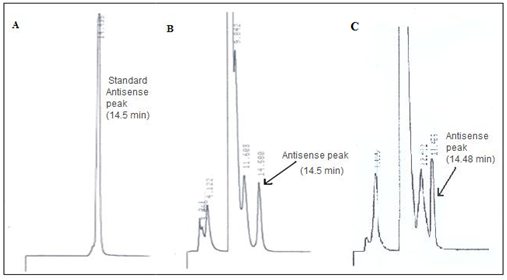 In addition to the integrity of the polymer, it was also important to verify the integrity of the antisense because the functionality of the antisense as a drug depends on the antisense sequence to remain intact. To determine the stability of the antisense and the structural integrity, the antisense was evaluated by HPLC before and six months after applying gamma-irradiation. For the purpose of the HPLC analysis, the drug was extracted from the microspheres. Oligreen fluorescence assay was used for extraction. The HPLC profile of pure antisense showed a retention time at 14.5 min (Figure 6A). The peaks at retention times 2 min and 3 min are due to the solvent; these two peaks were observed when only the solvent was analyzed. The HPLC profile of antisense oligonucleotide extracted from the microspheres before the stability test and the gamma- irradiation showed the presence of similar peak at 14.5 min. A similar peak was observed at the same retention time of 14.5 min of antisense oligonucleotide which was extracted from the microsphere after the process of gamma-irradiation. Thus the presence of the peak at 14.5 min retention time, which is the characteristic peak of 18-mer NF-kB antisense in all three cases and also the lack of any other peak at other time points other than those contributed by solvent and blank microspheres indicated the absence of any detectable degradation of the antisense oligonucleotide in the samples (Figure 6B and 6C). The presence of the peak at retention time 14.5 min before and after gamma-irradiation clearly indicates that the antisense was not affected by the process of gamma-irradiation.